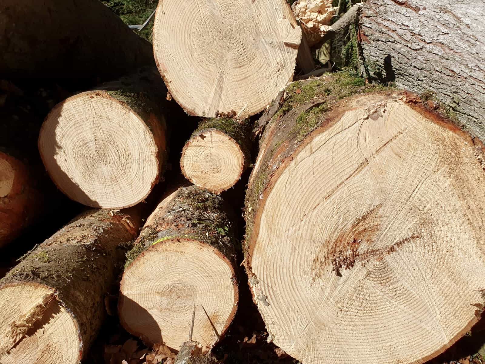 Auf dem Hof erwartet uns Simon Röthlisberger. Dieser soll uns etwas Licht ins Dunkle bringen bei unseren Fragen. Wie erwartet sitzt Simon nicht bei Kaffee und Kuchen in der warmen Stube, sondern steht draussen mit Heugabel und Stiefel. Er ist „im Holz“. Das Feld am Waldrand ist (noch) mit Tannästen übersäht und es türmen sich beeindruckend grosse Baumstämme auf. Winterzeit ist Holzer Zeit, denn Holzen ist nur dann möglich, wenn der Boden gefroren oder trocken ist. Beim aktuell aufgetauten und nassen Boden käme der Traktor den steilen „Hoger“ nicht hinauf. Nun heisst es ca. 4 Tage abwarten bis der Boden ganz trocken ist, um das Holz zu transportieren. Bis es weiterverarbeitet werden kann, muss das Holz noch zwei Jahre trockenen. Diese Tannen sind bereits reserviert. Ein Teil davon wird für die geplante Umgestaltung vom Friedhof in Hasle verwendet.